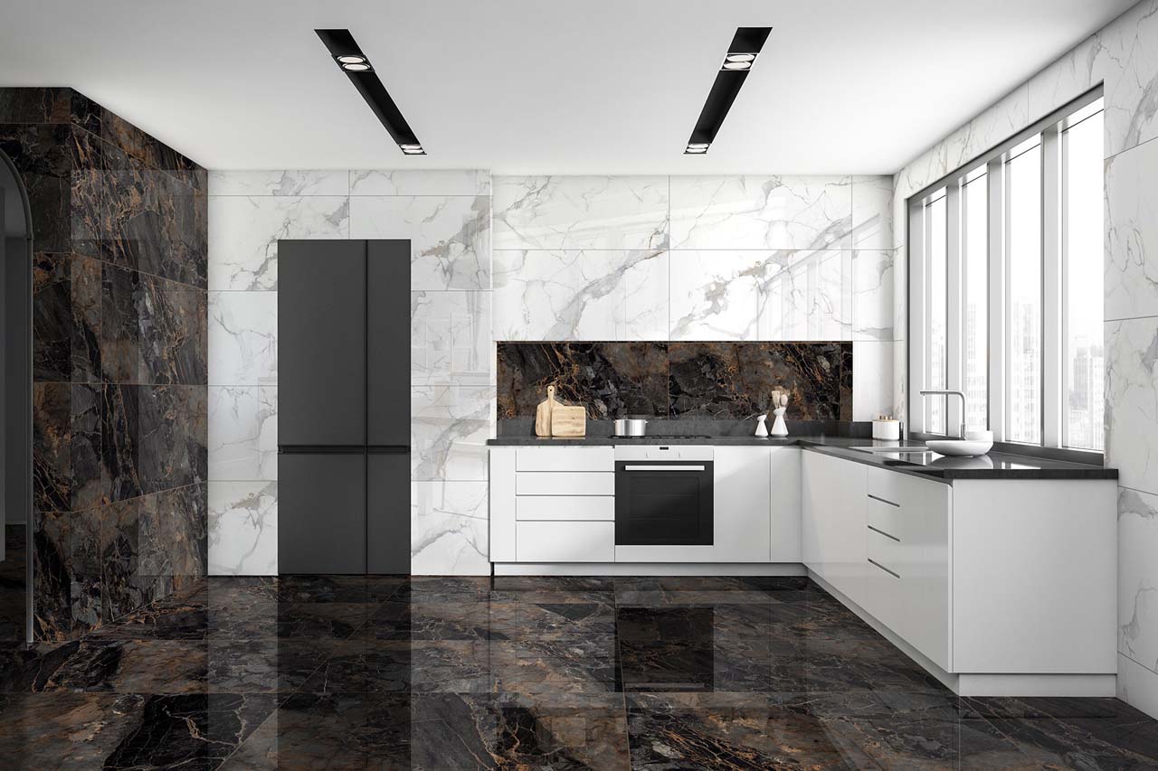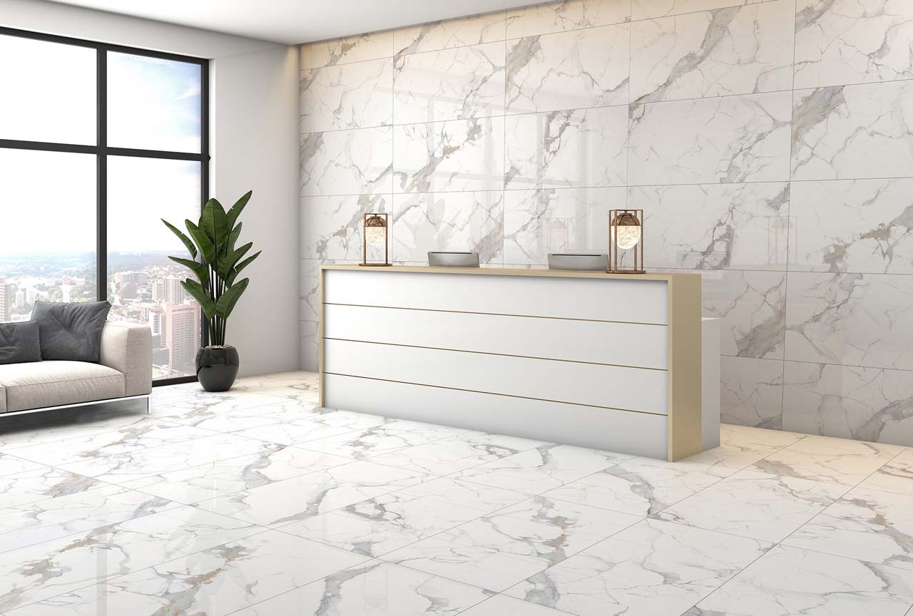 Коллекция керамогранита Calacatta Imperial – это сочетание изысканности и динамики, классики и современности. Плиты имитируют одну из разновидностей белого мрамора с характерным, узнаваемым рисунком. На белом с кремовым оттенком фоне протянулись серые и золотистые прожилки разной толщины. Несомненное преимущество керамогранита Calacatta Imperial – теплая цветовая гамма, которая значительно смягчает белый мрамор, избавляя его от холодной, стерильной чистоты. Темное золото прожилок добавляет рисунку живости, поэтому Calacatta Imperial дает возможность уделить больше внимания декору интерьера и вписать в него другие материалы, например, древесину в теплых, коричневых тонах и текстиль в близких оттенках. Спокойное очарование мрамора выглядит уместно везде, будь то небольшая ванная комната или театральный холл. Светлый фон помогает визуально расширить пространство и сделать его более освещенным.