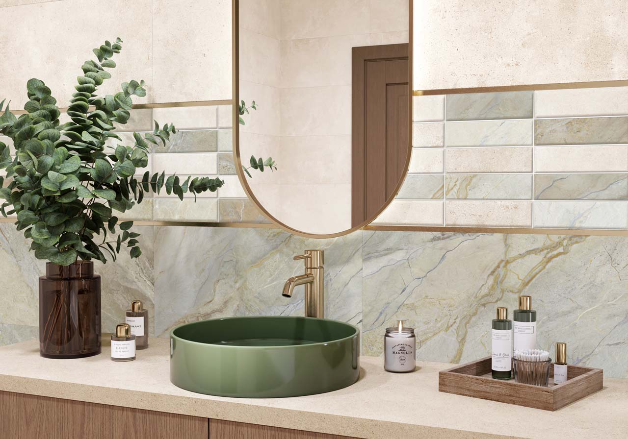 Глянцевая коллекция Arty — это сочетание текстуры разноцветного мрамора мятного оттенка и бежевого горного песчаника. Коллекция состоит из двух базовых плиток этих текстур и одного акцентного артикула, который объединяет их в прямоугольных фрагментах в виде кирпичей на рельефе. Такой набор элементов позволит создать индивидуальный дизайн, зонировать помещение и выделить функциональные зоны. Гармоничным сочетанием к этой серии станет плитка в виде деревянных плашек из коллекции Aurea. Дополняет композицию керамический бордюр 13x600 мм в платиновом цвете и матовый керамогранит в формате 600x600 мм.