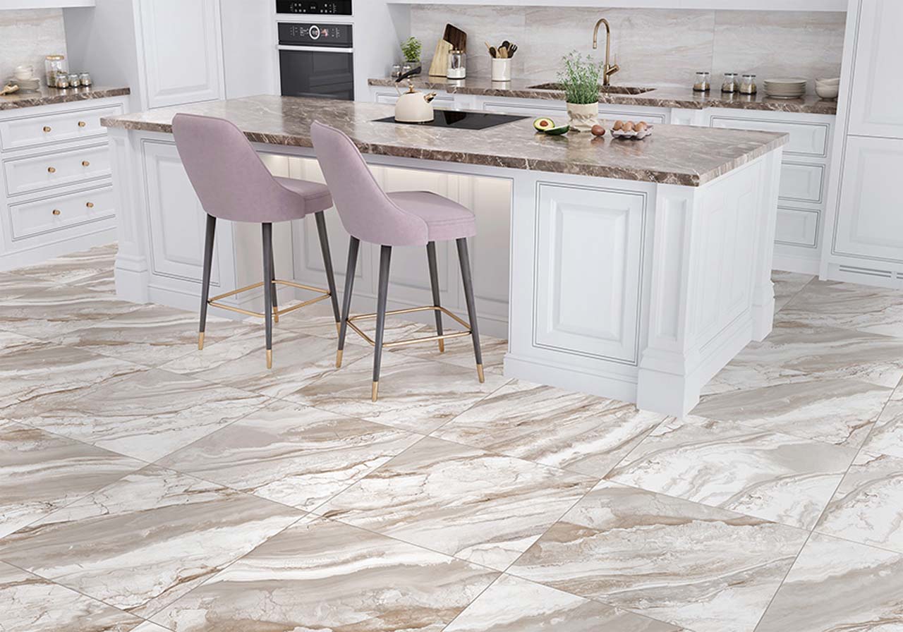 Сочетание португальского мрамора, бетона и эпоксидной смолы стали основой для этой оригинальной серии. Дизайнеры бренда специально для каждого лица подбирали рисунок таким образом, чтобы полутона графики плавно переходили с одной плитки на другую, создавая эффект градиентных волн и объёма без подбора и стыковки рисунка.