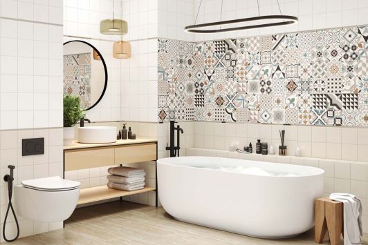 Коллекция керамической плитки Design Art позволит создать неповторимый и особенный интерьер. С такой коллекцией можно сочетать как плитки из коллекции, смешивая цвета, так и соединять их с другими форматами, текстурами дерева или камня. Результат будет великолепным, ведь коллекция создана для творчества. Такой дизайн универсален, так как он гармонично подойдет для любого интерьера, будь то кантри, классика, шебби-шик, прованс, эклектика или современный стиль. Формат плитки — 300x600 мм с матовой поверхностью. Коллекция состоит из восьми артикулов: акцентного декоративного массива на рельефе с рисунком пэчворк в трех цветах, ровной базовой плитки в универсальном светлом оттенке и четыре артикула с рельефом квадратов и пропилами. Преимущество пропилов в том, что можно использовать затирку контрастного цвета или в тон плитки, получив однородную стену из квадратных элементов 150х150 мм. Ещё одно преимущество пропилов — это экономия на стоимости укладки. Мастер-укладчик не будет дополнительно увеличивать смету за работу с мелким форматом плитки, ведь укладка размера 300x600 мм простая и не требует дополнительных усилий. Керамический стик 13x600 мм соединит все элементы в интерьере и гармонично будет сочетаться с сантехническими аксессуарами.