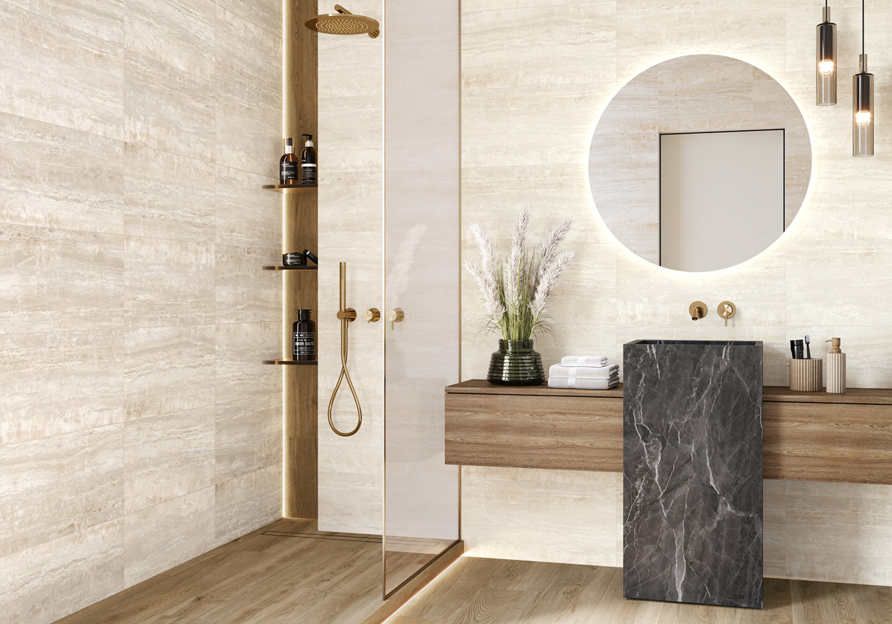 Модная коллекция под травертин в теплых оттенках. Травертин широко применяется в дизайне интерьеров благодаря своей природной красоте и универсальности. Такой вид мрамора прекрасно вписывается в различные стили, от классического до современного, и может стать ключевым элементом дизайна вашего пространства. Не ректифицированные края и матовая поверхность керамогранита подчеркивают натуральность и современность дизайна. Комбинация травертина коллекции Rim и текстурой дерева серии Goa создаст теплый и уютный интерьер с природной эстетикой. Такое сочетание идеально подходит для гостиных или загородных домов, добавляя интерьеру гармонии и тепла. Сочетание травертина и бетона из серии Flagman на разных стенах одного интерьера придаст интерьеру динамики и создаст современный интерьер с контрастом текстур. Это сочетание подойдет для офисов и городских квартир, добавляя интерьеру минимализма и стиля.